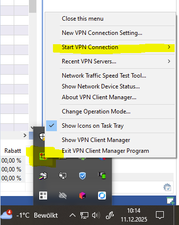 Nachdem die Verbindung konfiguriert wurde, kann die Verbindung entweder direkt über das Client-Fenster oder über das Tray-Icon aufgebaut bzw. wieder getrennt werden